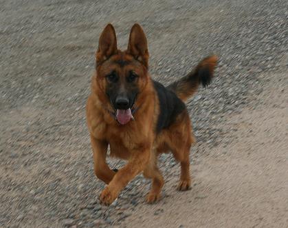 Maverick is our handsome black and red 80lb AKC German Shepherd. He is intelligent, friendly, loyal, and obedient. He is the son of Titan and Trinity and has VA1 and ScHH3 titled working dogs in his linage.