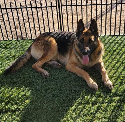 Charlie is our handsome black and tan 90lb AKC German Shepherd. He has solid nerves, intelligent, obedient, and loves to play ball! He comes from a linage of working dogs.